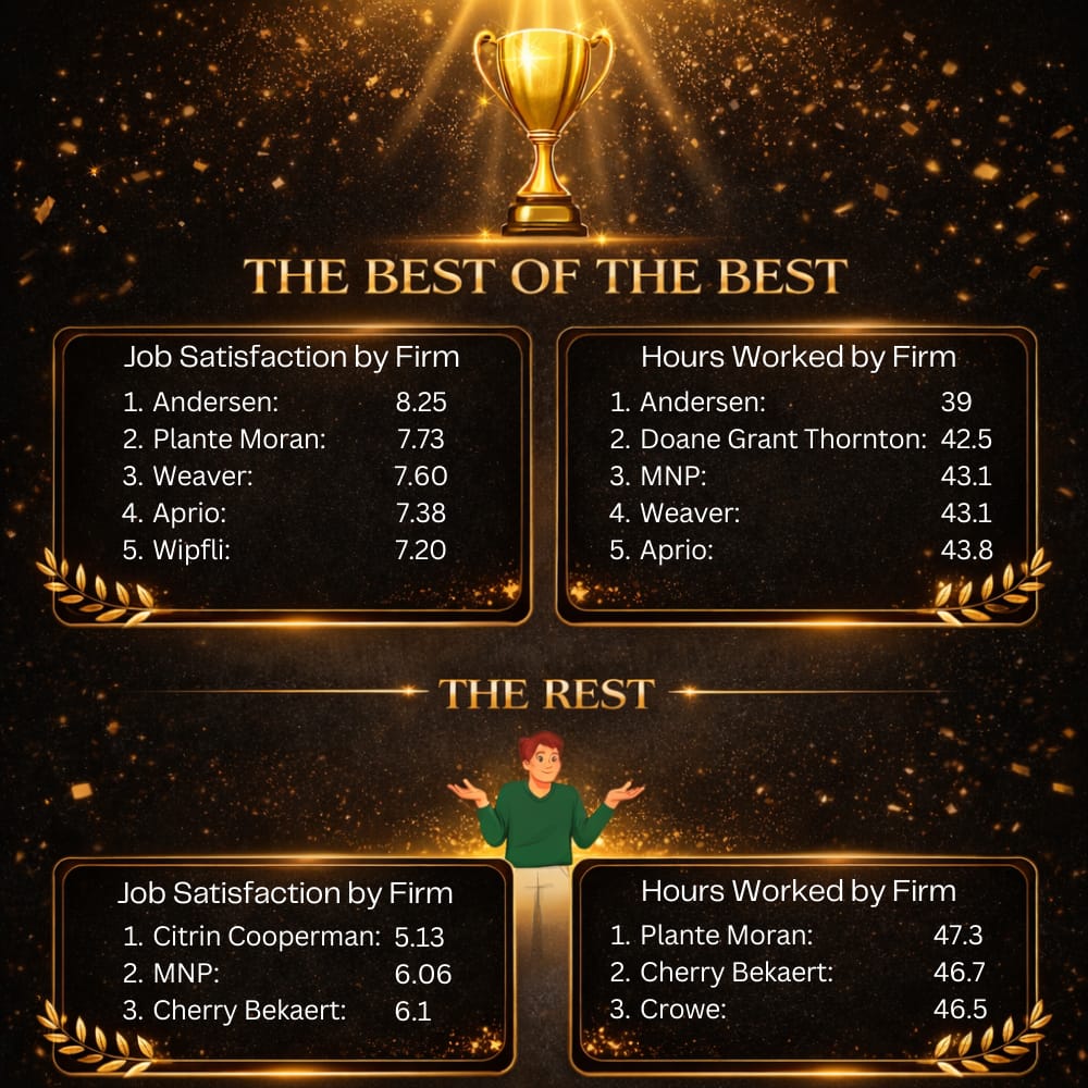 Iād genuinely love to hear from folks there. When people work long hours and still report high satisfaction, something interesting is happening. When I shared this graphic out online, a lot of folks from Plante Moran chimed in sharing that while they worked hard they felt they were always treated well with the right emphasis on personal growth and development of junior staff within the firm.